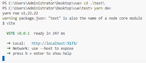 使用命令yarn create vite test --template vue 创建一个项目名为test项目模板为vue的项目