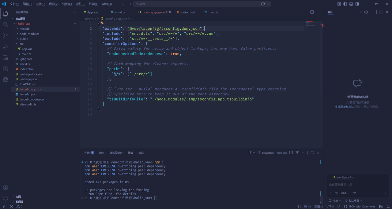 使用Vite创建项目https://cn.vuejs.org/guide/quick-start.html创建命令npm create vue@latest常见问题首次打开项目会有报错,是因为项目中没有依赖npm i //安装所有依赖