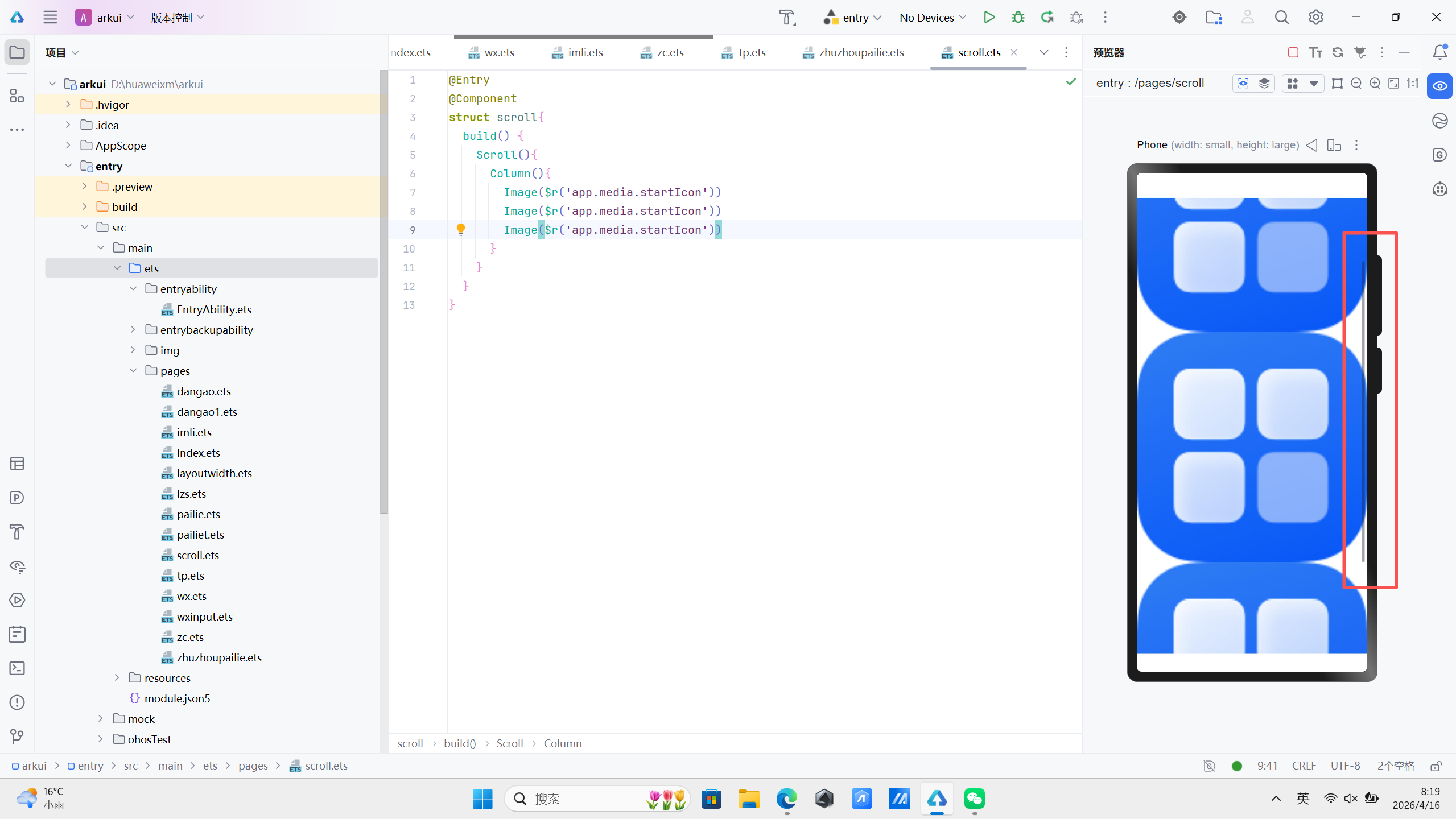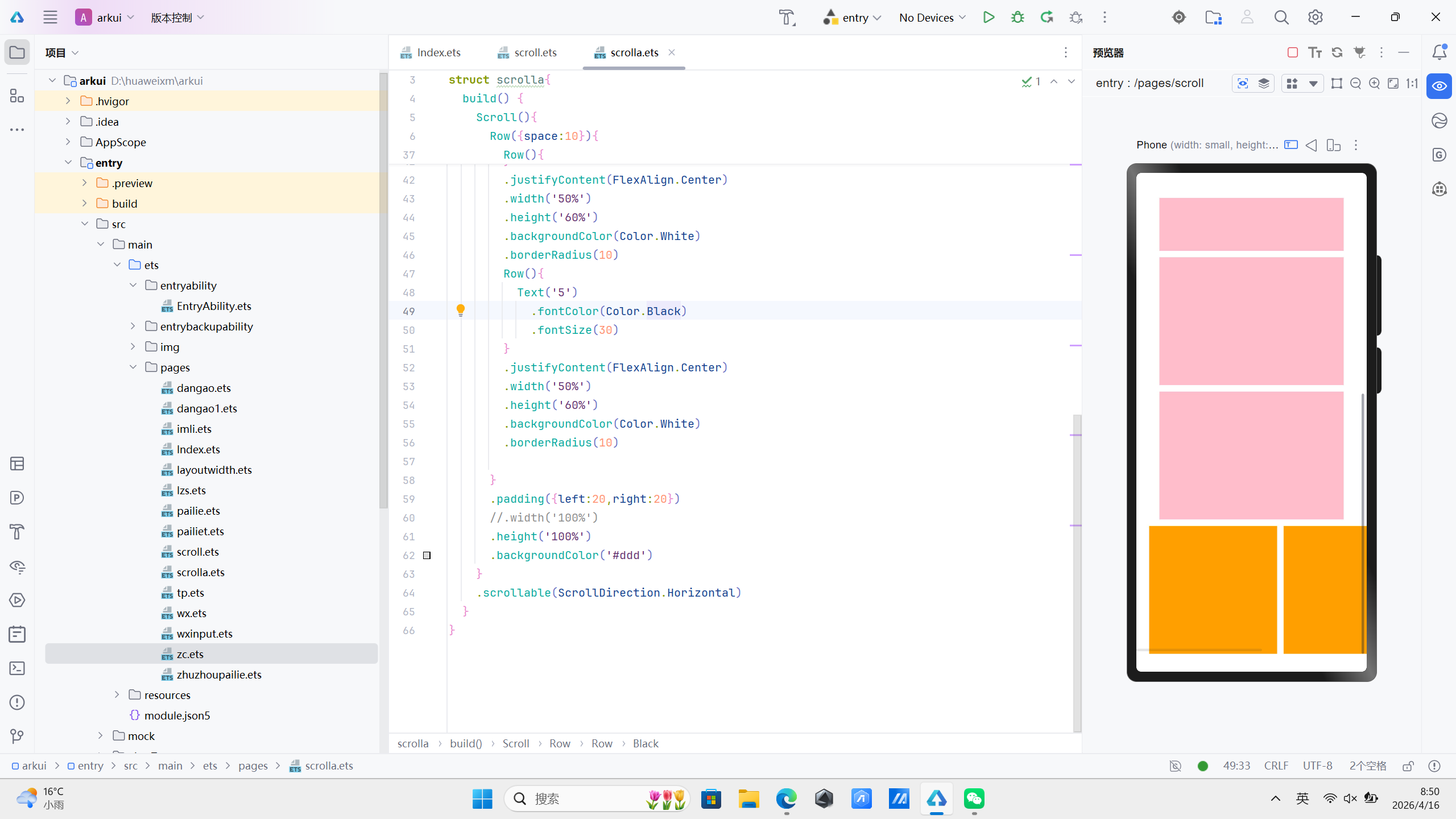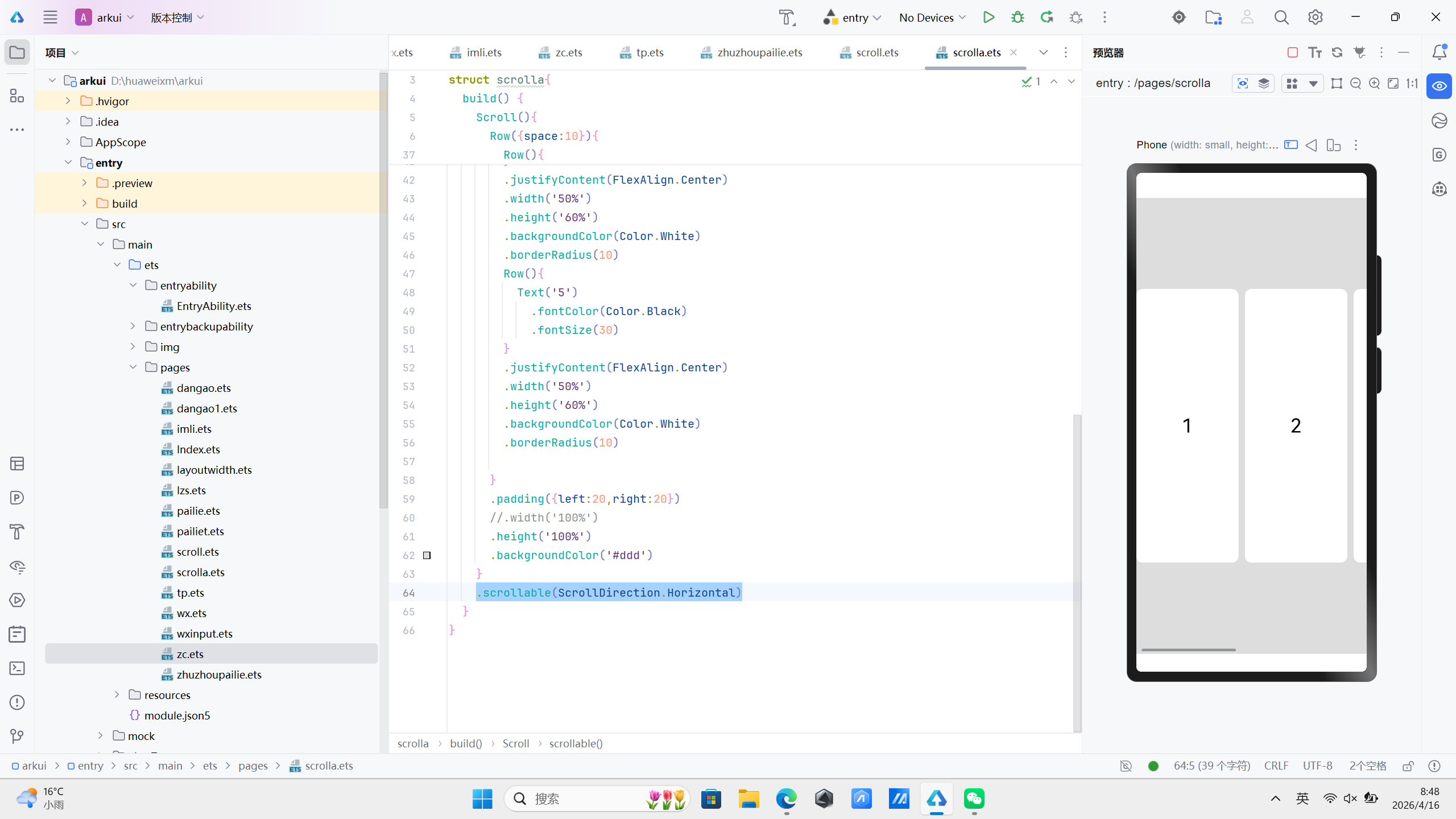 如果需要横向延申可以使用scrollable(ScrollDirection.Horizontal) 修改默认的延申方向