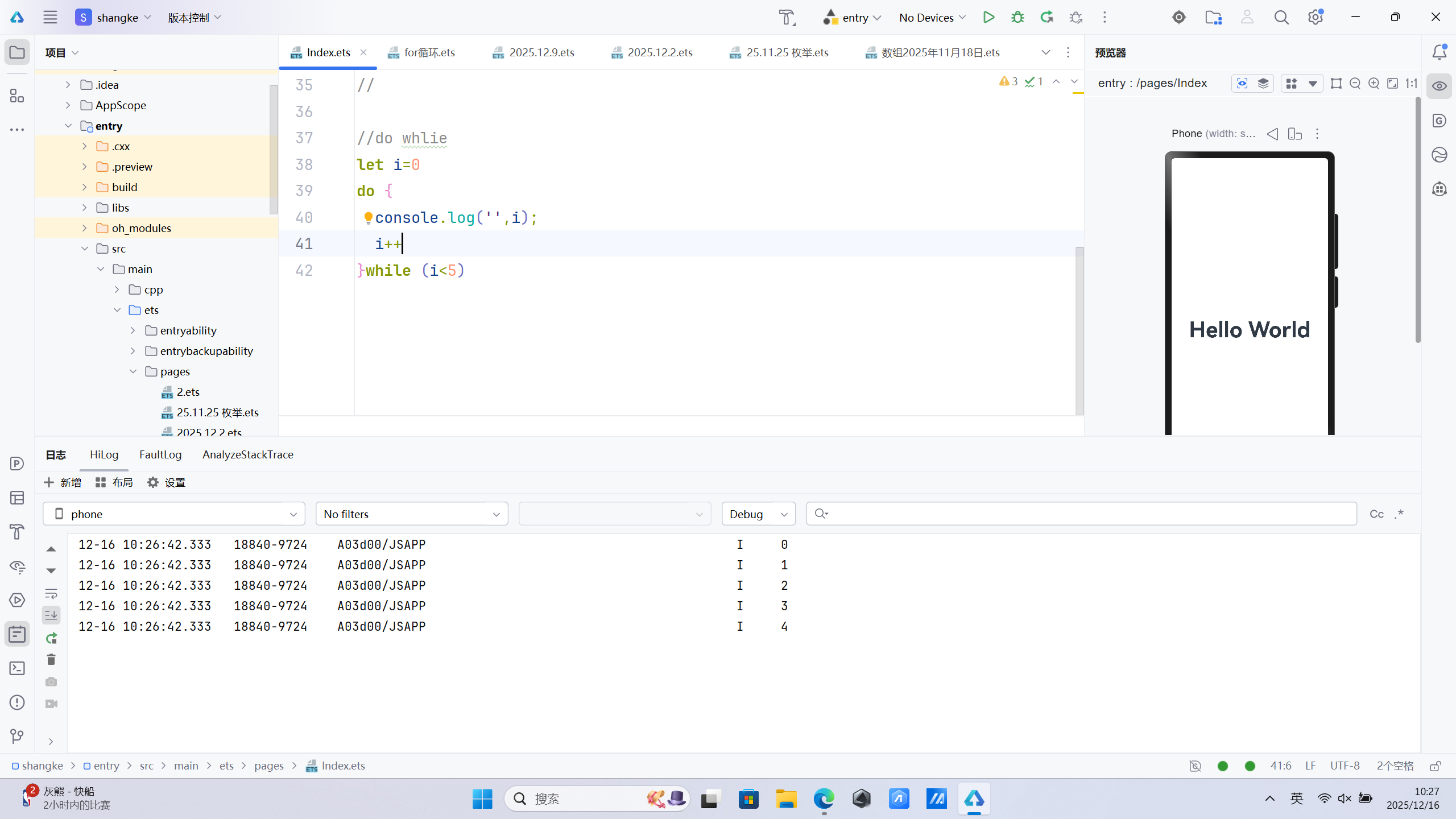 ArkTS 也支持 do-while 循环,与 while 的核心区别是:先执行一次循环体,再判断条件(循环体至少执行一次)